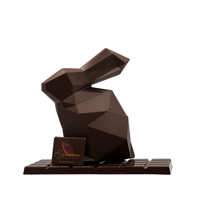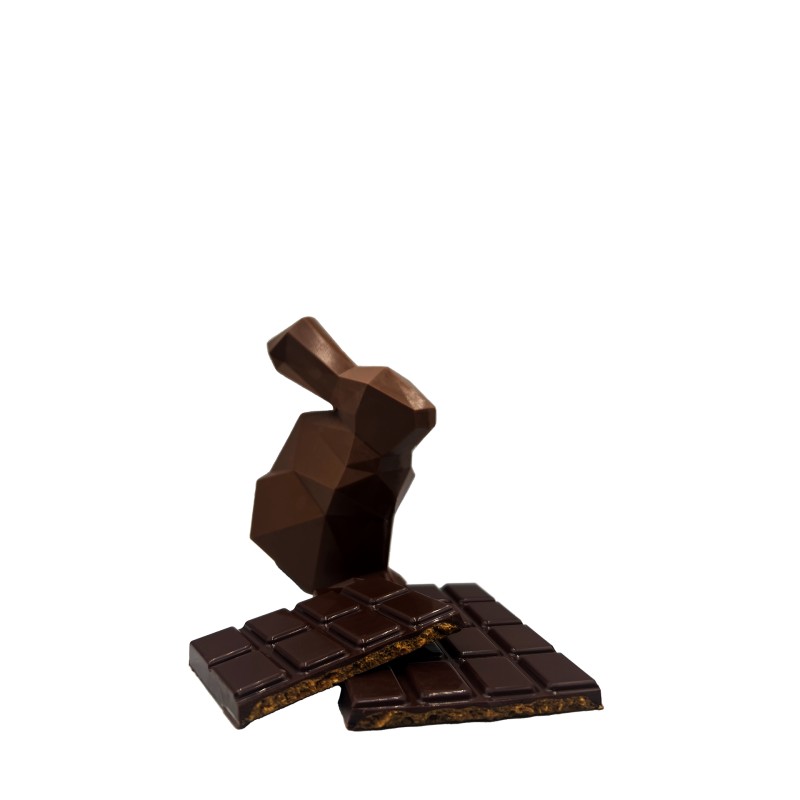 Ce petit lapin aux jolies formes géométriques est réalisé en chocolat noir MAYATA. Il repose sur une tablette de chocolat noir fourrée d'un praliné grué de cacao