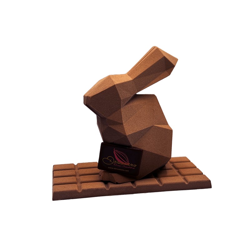 Ce petit lapin aux jolies formes géométriques est réalisé en chocolat au lait MAYATA. Il repose sur une tablette fourrée de caramel beurre salé.