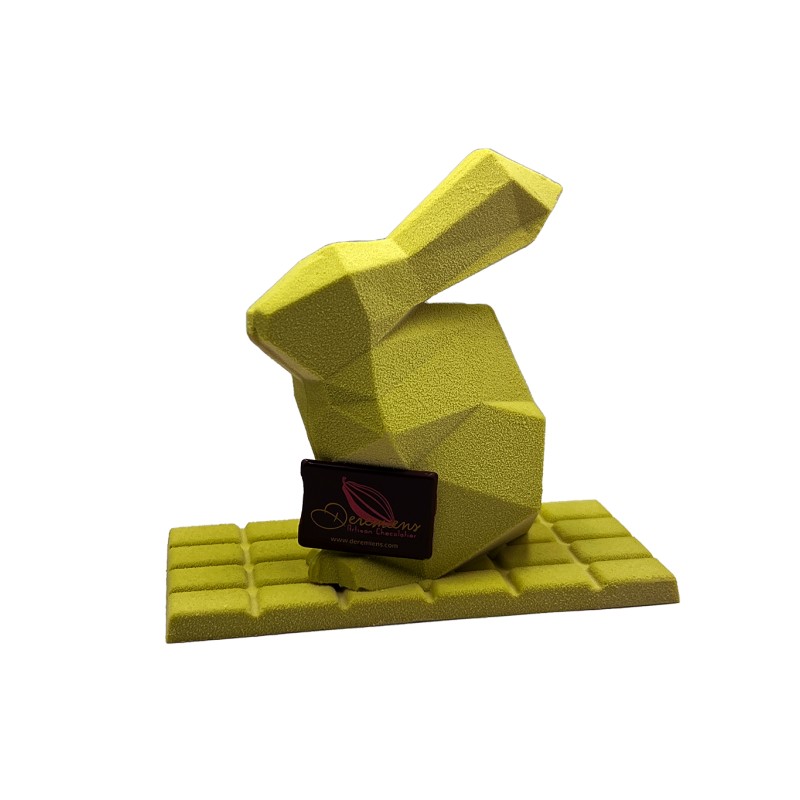 Ce petit lapin aux jolies formes géométriques est réalisé en chocolat blanc MAYATA. Il repose sur une tablette fourrée de praliné pistache.