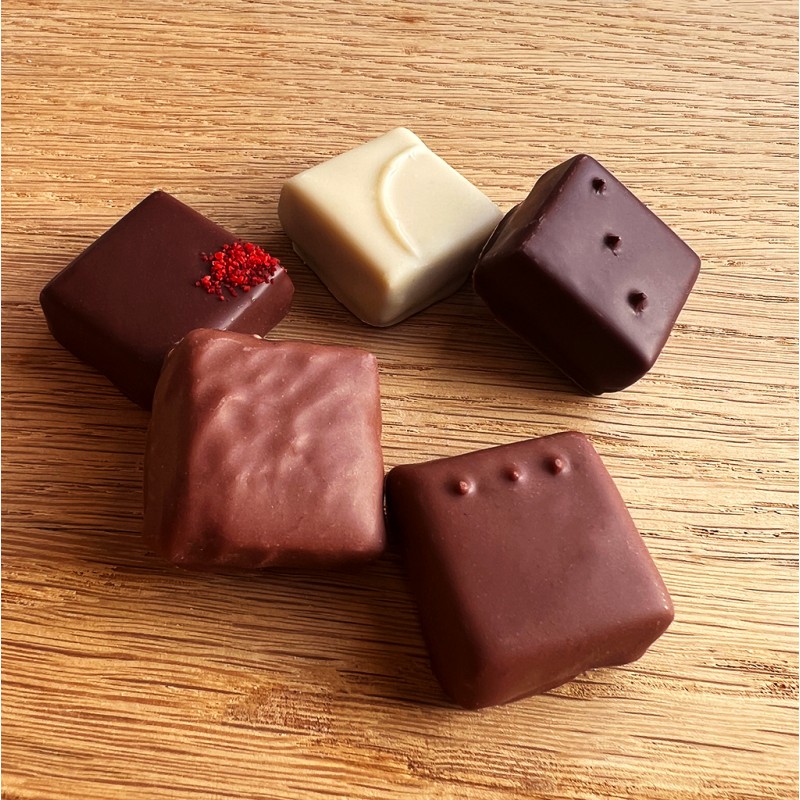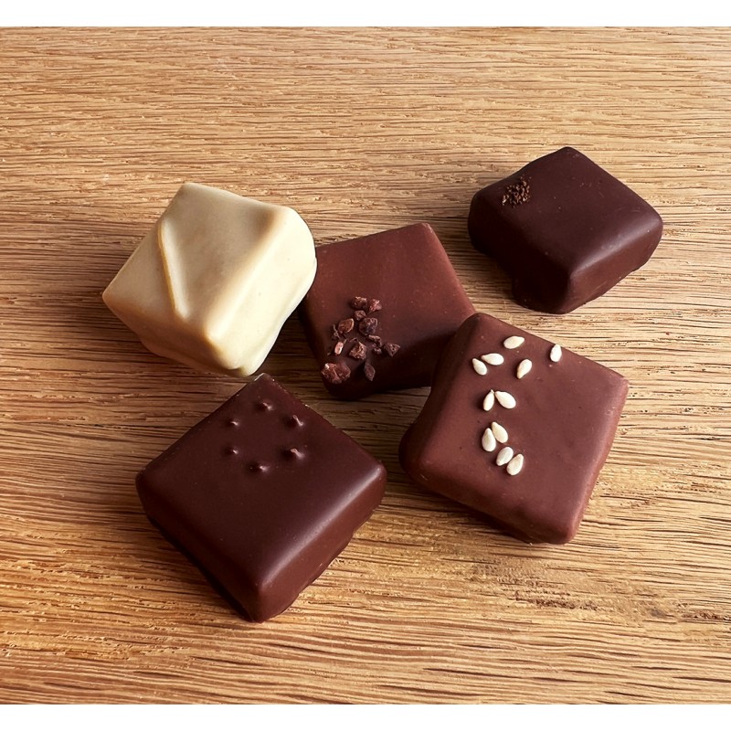 -PRALINÉS noir, lait et blanc. Aux saveurs délicates d'agrumes, de pistache, de spéculoos, de café, de noisettes, de graines de sésame et d'épices de Noël.