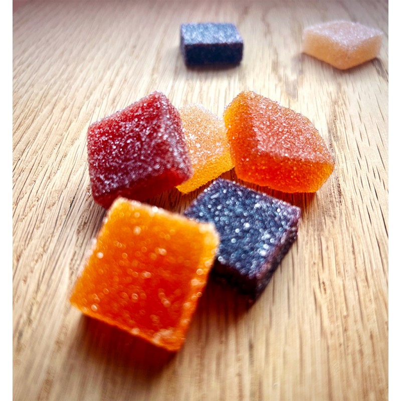 -PÂTES DE FRUITS audacieuses. Mûre-Cuberdon, Poire-Gingembre, Fraise-Vanille, Abricot-Bergamote, Litchi-poivre Timut, Passion-Mandarine, Griottes-Vin chaud, Myrtille-Citronelle.